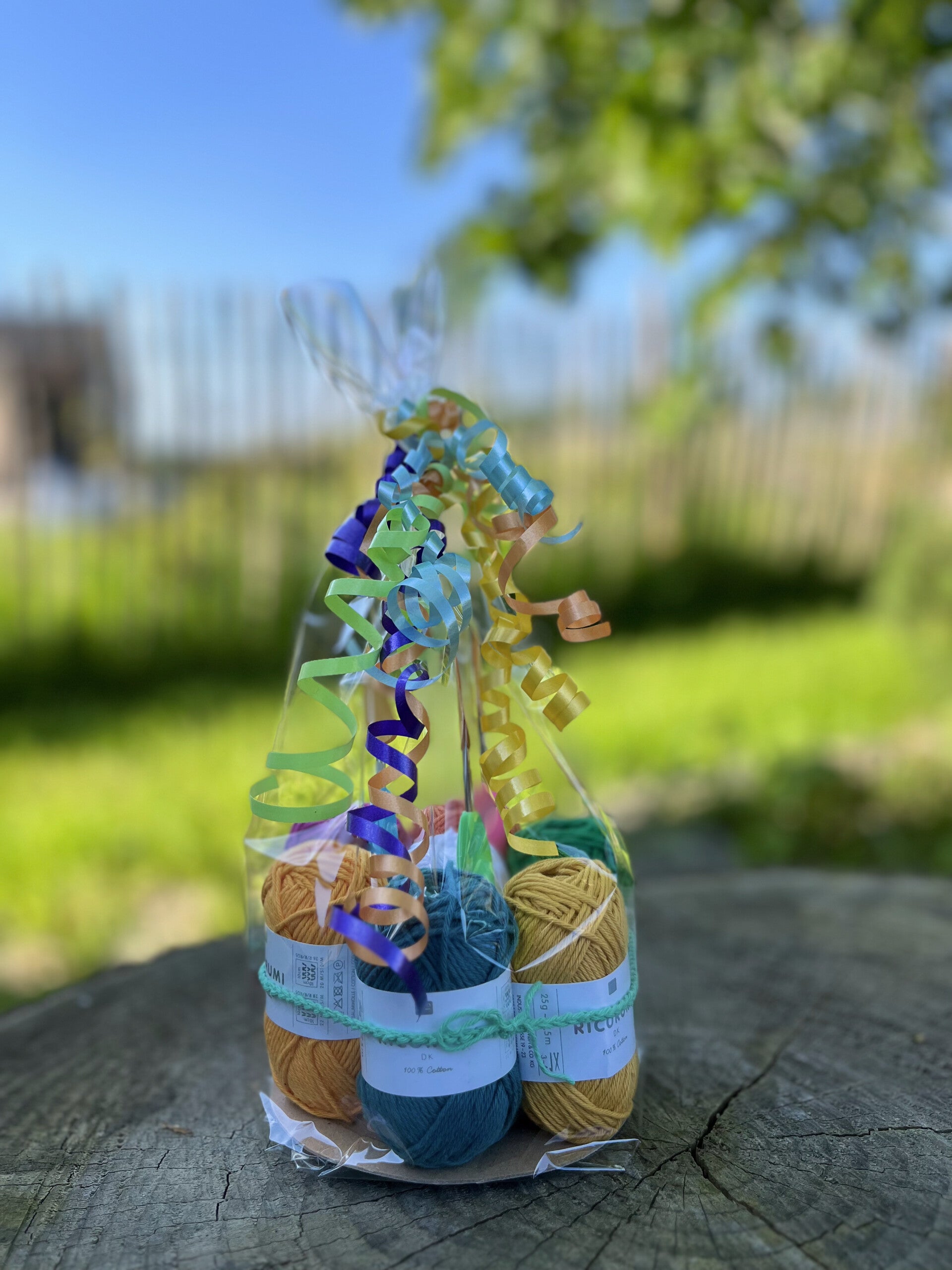 Woltaart bestaande uit 7 bolletjes Ricorumi katoengaren en 3 haaknaald. Uniek/ludiek verpakt als een taart.