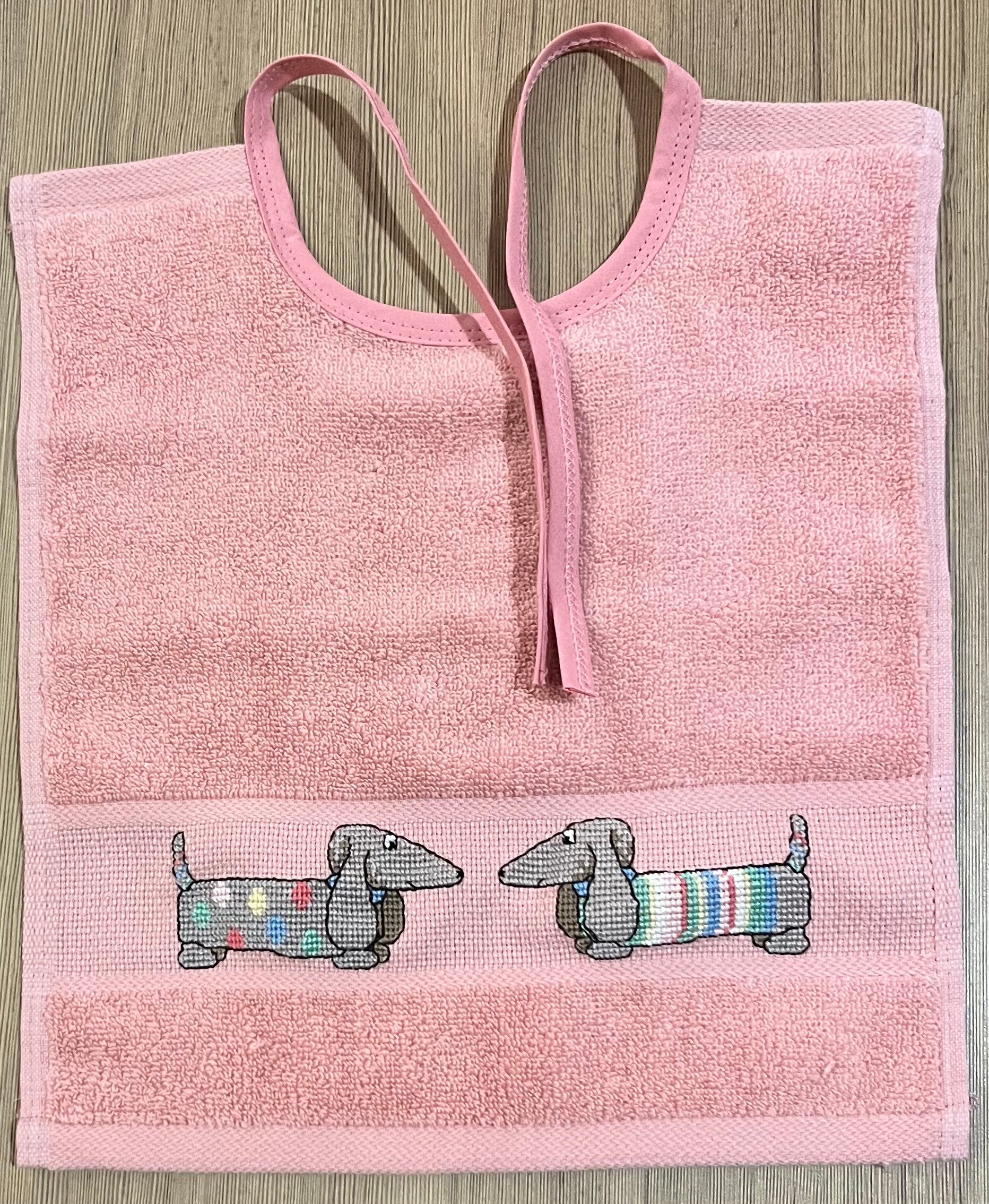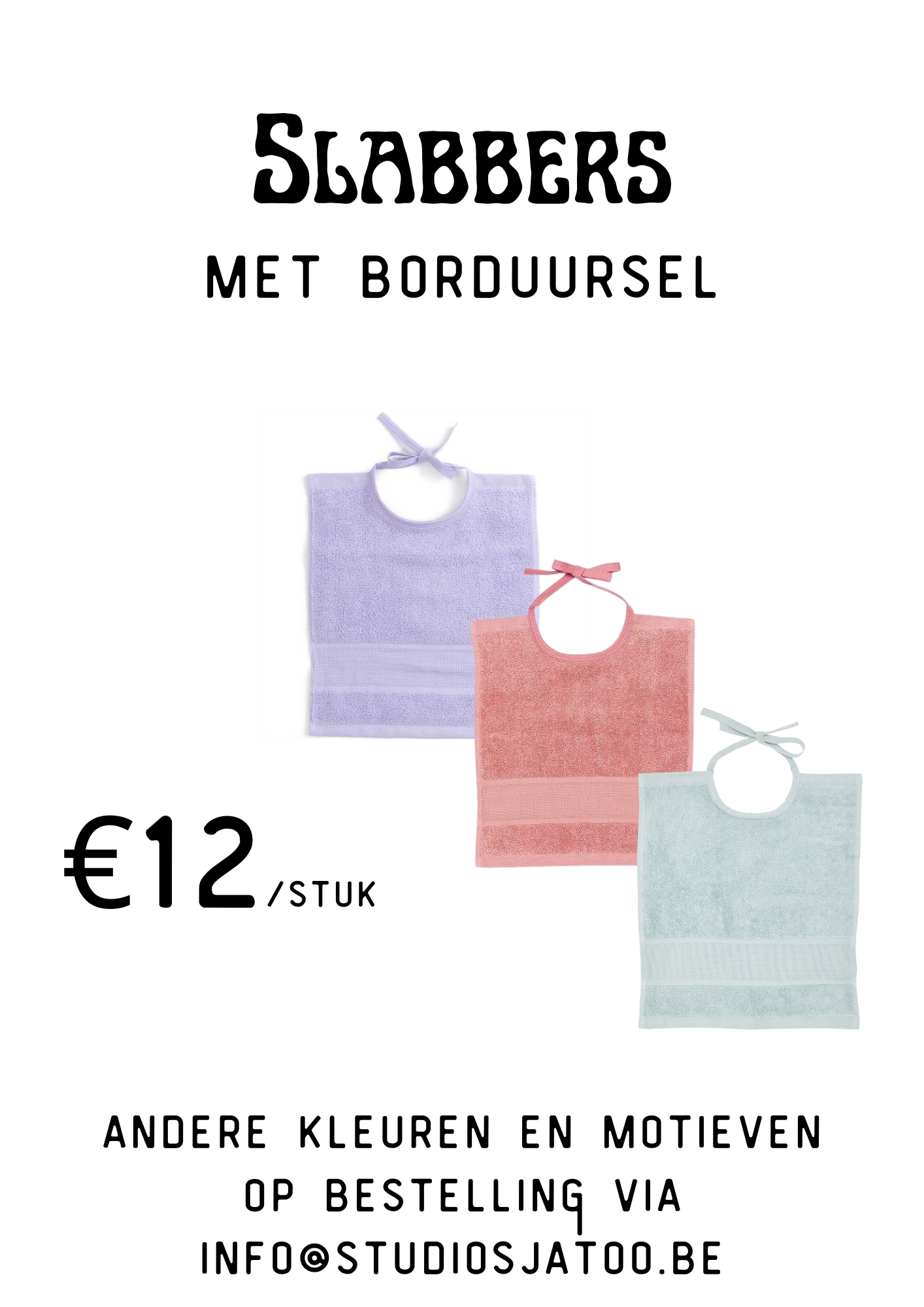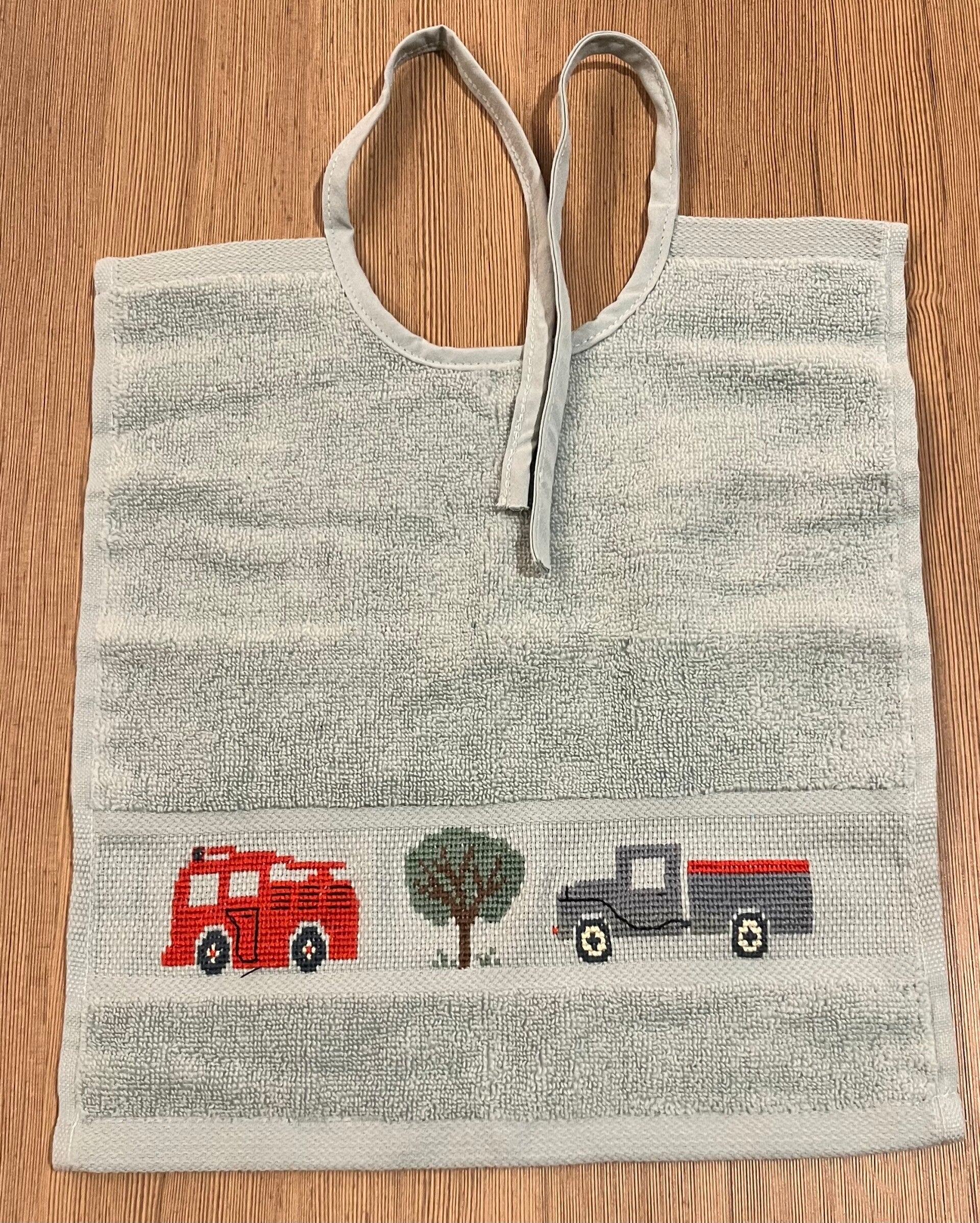 Kwalitatieve slabbers met handgenaaide tekening.